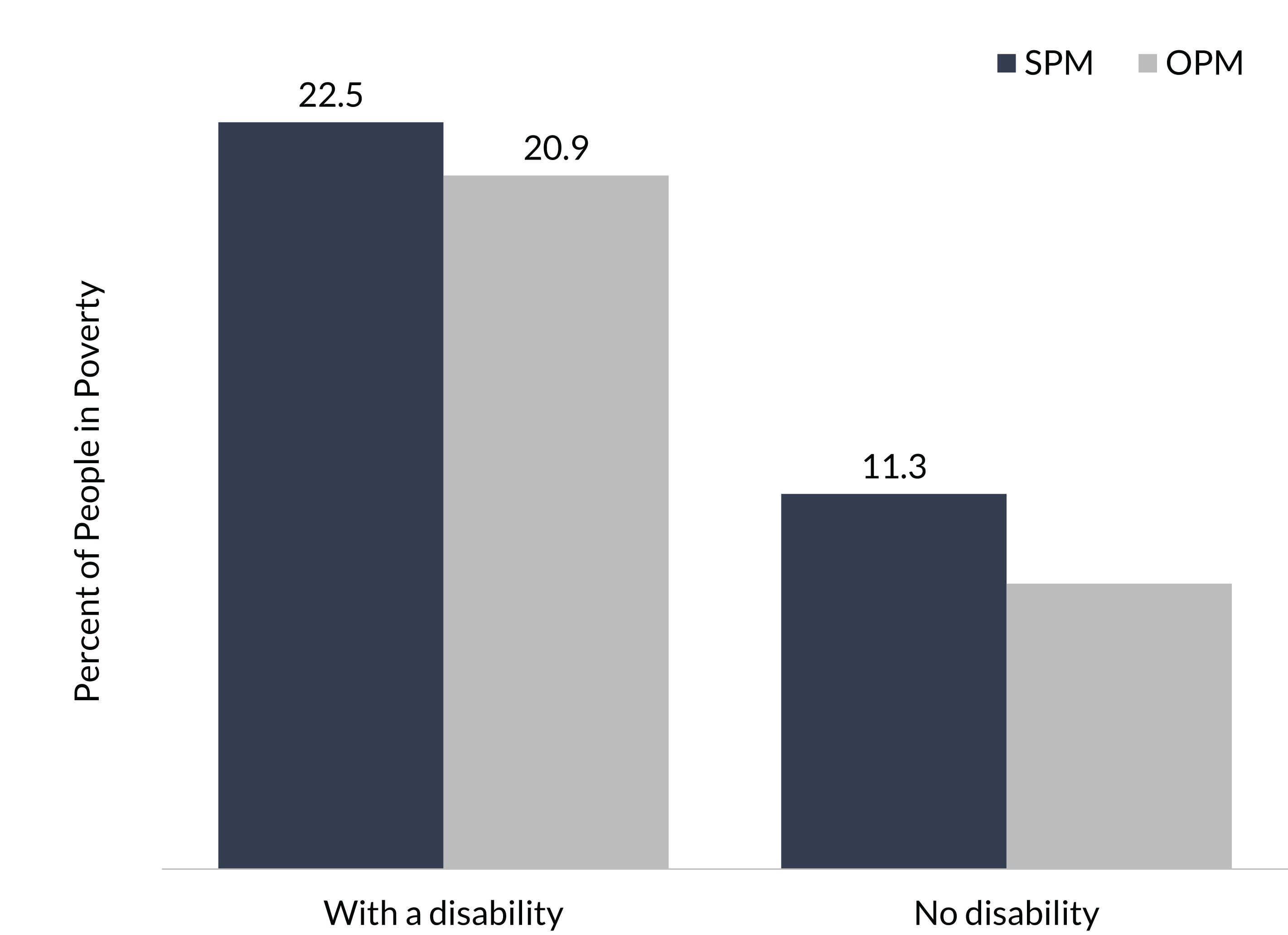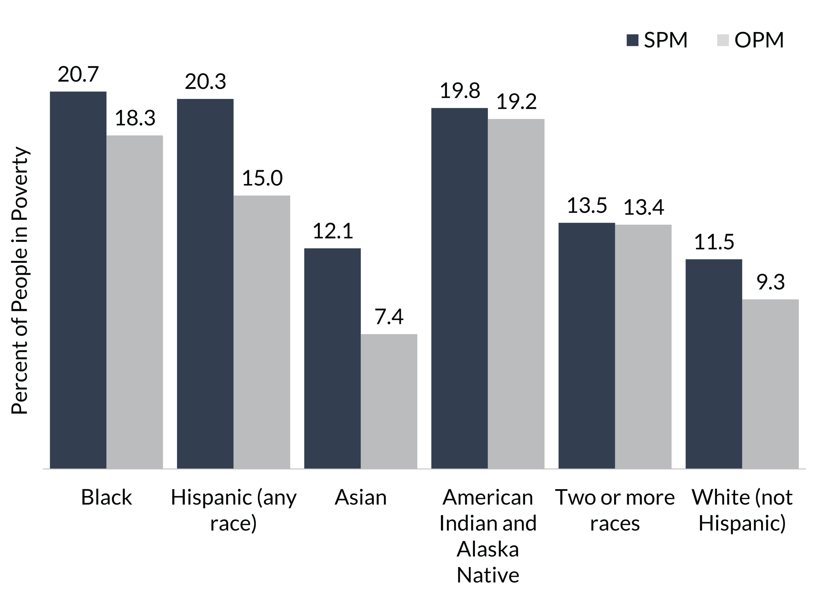 The official U.S. poverty rate when it was first measured in 1959 was 22.4%. After a major decline throughout the 1960s, the overall poverty rate has hovered between about 10% and 15%. During that period, the SPM or historical SPM has generally been a few points higher than the OPM (because the SPM has higher and more accurate poverty thresholds). This pattern was reversed in 2020 and 2021 because the SPM rate reflected the poverty-reducing effect of public benefits offered in response to the COVID-19 pandemic. The pattern reversed again in 2022 and has maintained its historical norm of the SPM (12.9%) being a few points higher than the OPM (11.1%).